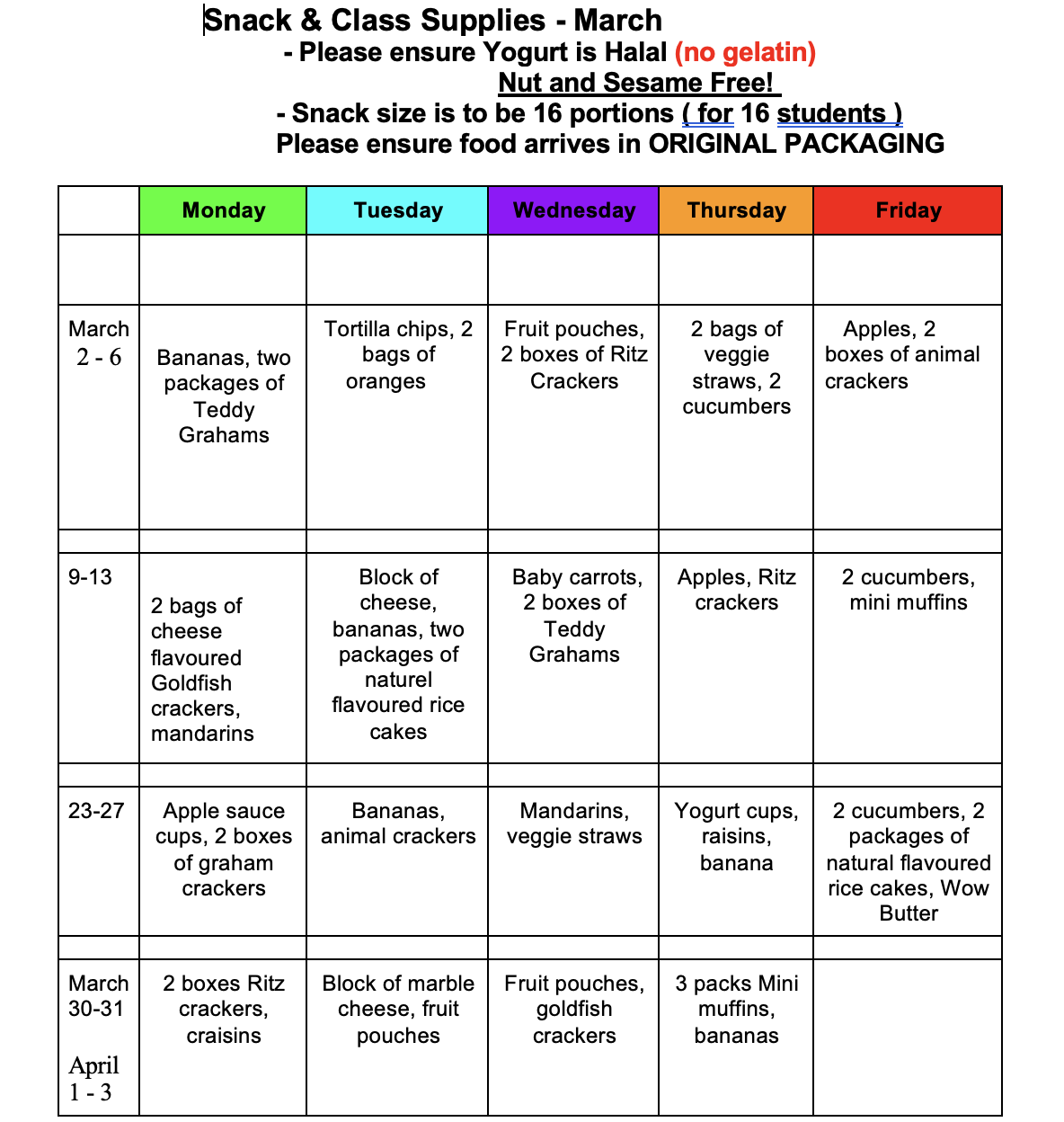 MONTHLY SNACK AND ACTIVITY SCHEDULES